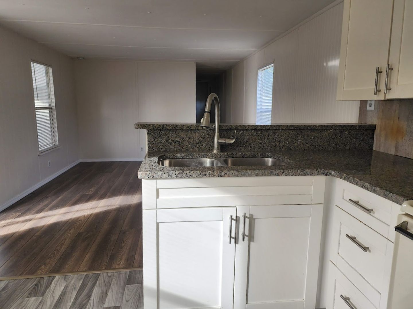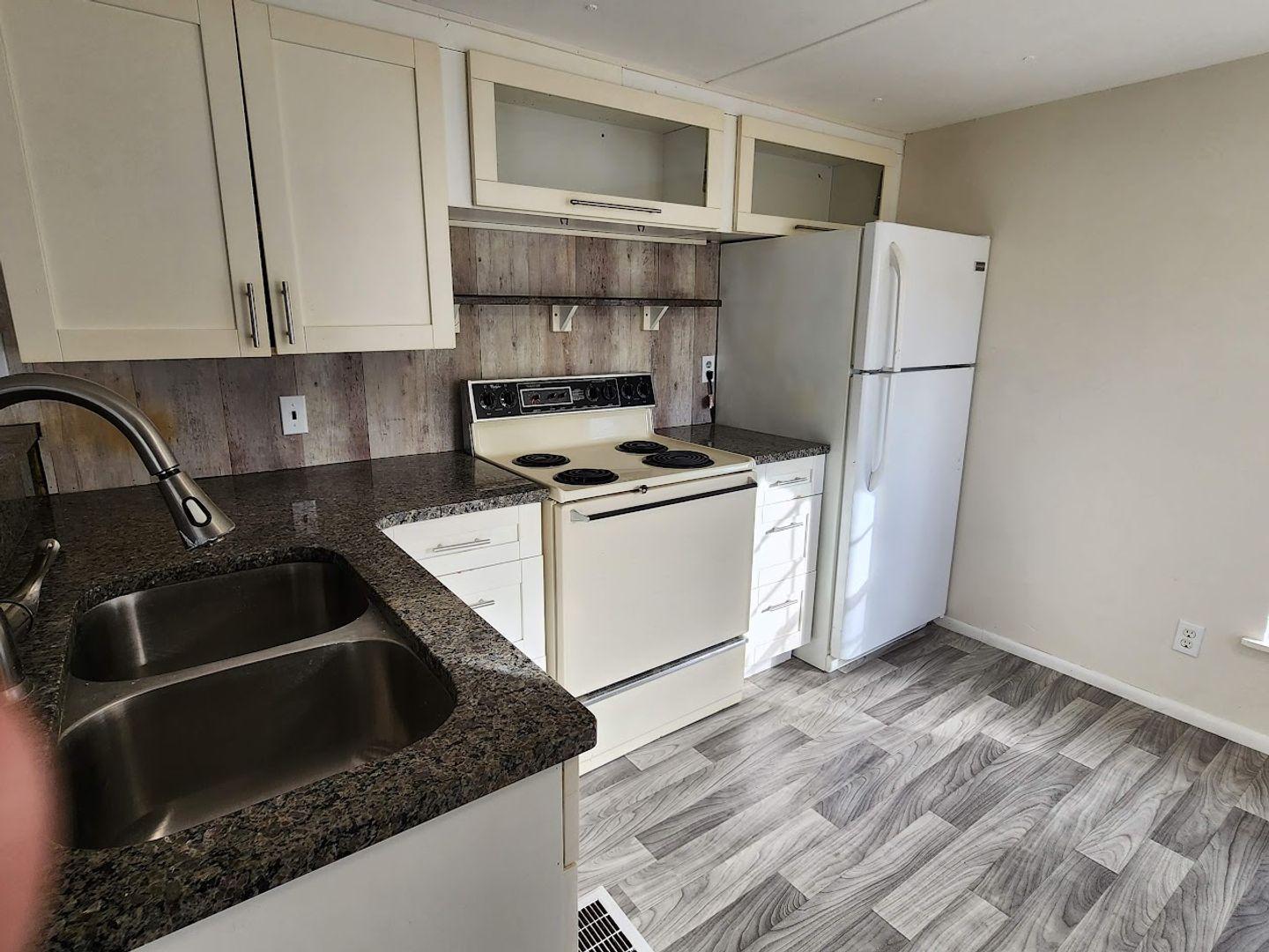 This 2 Bed/ 1 Bath home features updated white kitchen cabinets, granite counter-tops, wood-look vinyl flooring, good sized yard, car-port, laundry room with additional storage and central air!